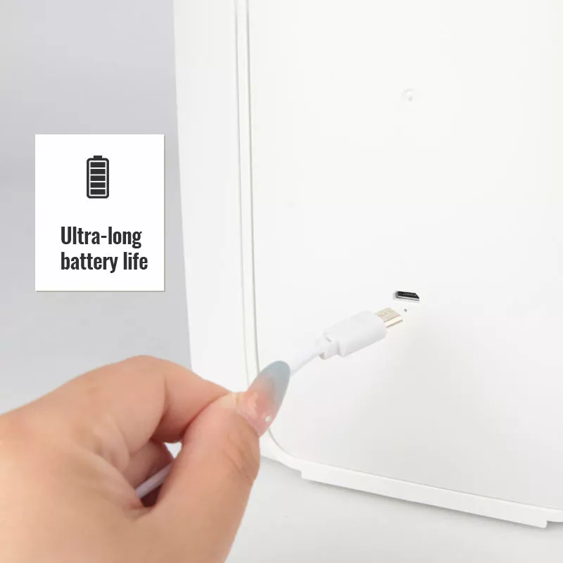 अंतर्निर्मित रिचार्जेबल बैटरी द्वारा संचालित, यह दर्पण यूएसबी-सी फास्ट चार्जिंग का समर्थन करता है और विस्तारित उपयोग के लिए अल्ट्रा-लंबी बैटरी जीवन प्रदान करता है। बार-बार रिचार्ज करने की कोई आवश्यकता नहीं है, जो इसे दैनिक घरेलू उपयोग और लंबी यात्राओं दोनों के लिए विश्वसनीय बनाता है। ऊर्जा-कुशल एलईडी डिज़ाइन बिजली की खपत को भी कम करता है।